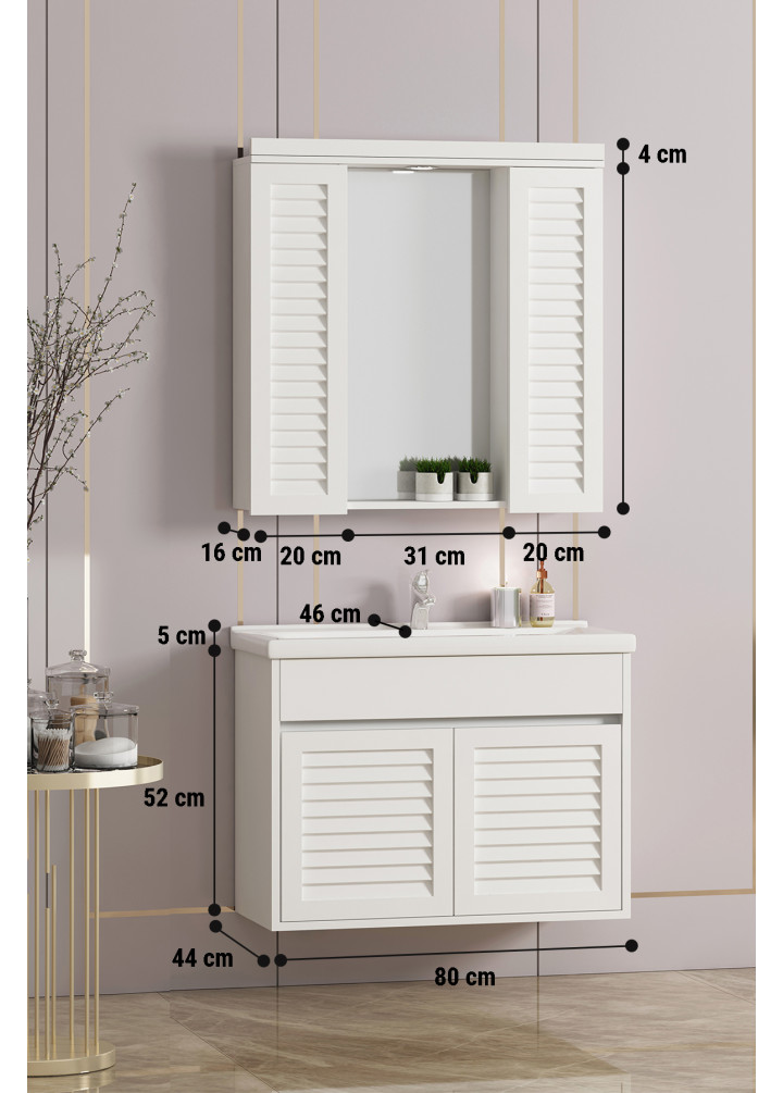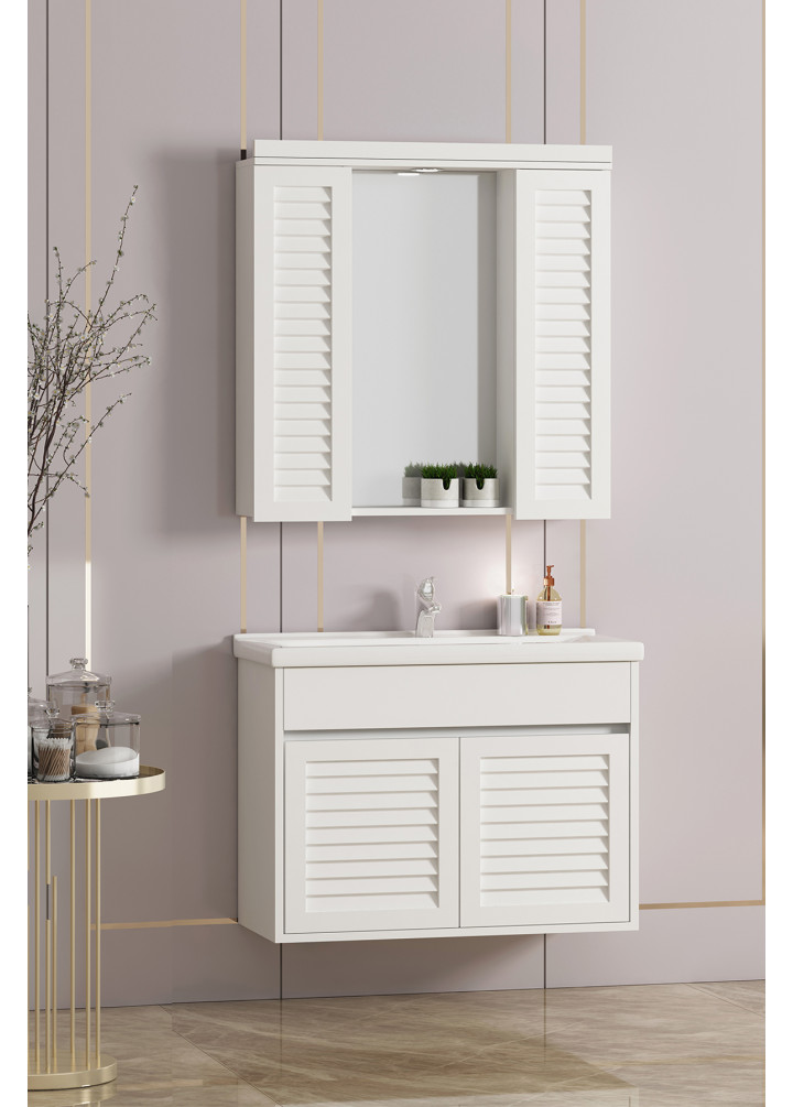 Çuha 80 cm Beyaz MDF Panjurlu Balon Kapak Seramik Lavabolu Asma Banyo Dolabı Takımı