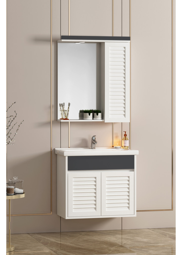 Çuha 55 cm Beyaz-Antrasit Gri MDF Panjurlu Balon Kapak Seramik Lavabolu Asma Banyo Dolabı Takımı
